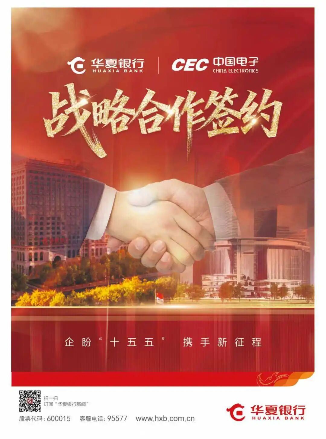 12月24日,華夏銀行與中國電子資訊産業集團有限公司(以下簡稱 “中國電子”)戰略合作簽約儀式在北京舉行。中國電子黨組成員、副總經理謝慶林,華夏銀行黨委副書記、行長瞿綱出席活動並致辭。中國電子戰略合作部主任吳晶,華夏銀行黨委常委、副行長唐一鳴代表雙方簽約。