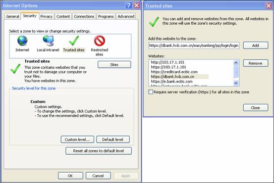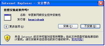 (一)登錄前的準備工作 1、櫃面簽約 客戶本人持有效證件和華夏借記卡前往我行營業網點辦理網上個人銀行簽約手續,需在《華夏銀行電子銀行個人客戶服務申請表》中勾選申請個人數字證書選項,並領取華夏盾。 2、安裝華夏盾 (1)將華夏盾插入主機USB介面,如果您的作業系統未安裝過該驅動,且作業系統“自動運作”配置為“允許”,對於Windows XP系統,一般系統將自動安裝華夏盾驅動;對於Windows Vista系統,一般系統將彈出如下窗口,請點擊“運作setup.exe”即可安裝華夏盾驅動。 如果是epass3003則顯示為: ![]() 如果是2000auto則顯示為: ![]() (2)如果您的作業系統“自動運作”配置為“禁止”,資源管理器可能出現如下虛擬驅動器,請雙擊該盤符,系統可能會安裝華夏盾驅動。 如果是epass3003則顯示為: ![]() 如果是2000auto則顯示為: ![]() (3)如果雙擊該盤符後,系統沒有安裝華夏盾驅動,請進入該盤文件夾,點擊“setup.exe”即可安裝華夏盾驅動。 如果是epass3003則顯示為: ![]() 如果是2000auto則顯示為: ![]() (4)華夏盾驅動安裝成功後,如果成功識別華夏盾,則系統托盤區會出現如下圖標。 ![]() (5)驅動安裝成功後,如果您的華夏盾未設置過PIN碼,系統將自動彈出設置華夏盾PIN碼輸入框。客戶設置PIN碼成功後,以後下載證書、登錄網上個人銀行證書版和執行匯款交易時,均需使用該PIN碼。如需修改華夏盾PIN碼,請使用系統“所有程式”中的華夏盾管理工具進行修改。 ![]() 3、安裝網上銀行客戶端控件 (1)在新網銀上,客戶端控件均會自動安裝,滑鼠點擊IE最上方的“安裝ActiveX”,如下圖所示: ![]() 點擊“安裝” ![]() ![]() ![]() ![]() 安裝完成,顯示網銀登錄頁面 ![]() (2)如果客戶IE安全級別較高,直接阻止控件自動安裝,請從我行網站首頁進入“下載專區”,點擊“下載新網銀客戶端控件”,把該控件下載到本地手動安裝。 (3)運作該控件安裝包,完成網上銀行客戶端控件安裝。 4、下載數字證書(本操作適用於型號為EnterSafe ePass3003的華夏盾) (1)從我行網站首頁進入網上個人銀行證書版“證書下載”後點擊“下載CFCA數字證書”。 ![]() (2)請確認站點:“https://www.hxb.com.cn”、“ https://dbank.hxb.com.cn/”與“http://www.cfca.com.cn”已加入IE可信站點,方法:打開IE瀏覽器->點擊“工具”->“Internet選項”->“安全”->“可信站點”->“站點”,添加相應站點。 ![]() (3)如您的作業系統為Windows Vista,請確認IE可信站點的安全設置已關閉保護模式,方法:打開IE瀏覽器->點擊“工具”->“Internet選項”->“安全”->“可信站點”->取消“啟用保護模式(要求重新啟動Internet Explorer)(P)”復選框。 (4)如您的作業系統為Windows Vista,請確認IE可信站點的安全設置已啟用“對未標記為可安全執行腳本的ActiveX控件初始化並執行腳本”,方法:打開IE瀏覽器->點擊“工具”->“Internet選項”->“安全”->“可信站點”->自定義級別->啟用“對未標記為可安全執行腳本的ActiveX控件初始化並執行腳本”。 ![]() (5)確認華夏盾插入主機USB介面,並被系統識別;點擊“下一步”,進入下載數字證書輸入參考號、授權碼、選擇CSP的頁面;輸入數字證書密碼信封中的“參考號”和“授權碼”,根據華夏盾類型,確認對應的CSP為“EnterSafe ePass3003 CSP v1.0 for HXB”。 注意:如果CSP列表框為空,請確認華夏盾驅動已正確安裝,系統成功識別華夏盾;瀏覽器Microsoft Certificate Enrollment控件已啟用且運作。切勿強行下載,以免造成數字證書下載失敗,參考號與授權碼失效。 ![]() (6)點擊“下載”,出現證書請求的確認對話方塊。 ![]() (7)點擊“Yes”按鈕,出現華夏盾PIN碼輸入框。 ![]() (8)輸入華夏盾PIN碼,點擊“確定”按鈕,如校驗通過,則開始生成密鑰對。 ![]() ![]() (9)生成密鑰對成功後,開始安裝數字證書,出現證書安裝請求的確認對話方塊。 ![]() (10)點擊“Yes”按鈕,顯示數字證書安裝結果,出現請求安裝證書鏈的確認對話方塊。 ![]() (11)點擊“Yes”按鈕,顯示證書鏈安裝結果,確認證書安裝情況。 ![]() (12)如您的作業系統為Windows Vista,當您的數字證書已成功下載至華夏盾後,為了使您的系統獲得更高的安全級別保護,您可以對可信站點的安全級別設置禁用“對未標記為可安全執行腳本的ActiveX控件初始化並執行腳本”,方法:打開IE瀏覽器->點擊“工具”->“Internet選項”->“安全”->“可信站點”->自定義級別->禁用“對未標記為可安全執行腳本的ActiveX控件初始化並執行腳本”。 溫馨提示: a、數字證書自櫃檯辦理之日起,請在14日內使用兩碼將數字證書下載到華夏盾中。如未按時下載,兩碼將失效,需要客戶本人持有效證件到數字證書原頒發網點櫃檯重新辦理。 b、數字證書兩碼使用一次後作廢,切勿重復下載!以免造成已下載到華夏盾中的數字證書丟失。 5、安裝數字證書鏈(本操作適用於型號為EnterSafe ePass3003的華夏盾) (1)線上安裝CFCA數字證書鏈(該方式適用於Windows XP,不適用Windows VISTA系統) (2)離線安裝CFCA數字證書鏈幫助説明(該方式適用於Windows Vista,內容來自CFCA,當您確認瀏覽並點擊連結後,將彈出CFCA的幫助説明頁面,其URL為http://www.cfca.com.cn/tongyi/help/tips3.html) 以下內容為線上安裝CFCA數字證書鏈流程(該方式適用於Windows XP,不適用Windows VISTA系統): a、從我行網站首頁進入網上個人銀行證書版“證書下載”後點擊“安裝CFCA數字證書鏈”。 ![]() b、點擊“Yes”按鈕,信任該網站。 c、安裝CFCA